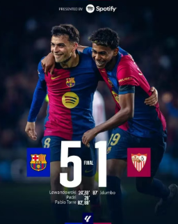 U 10. kolu La Lige sezone 2024-25, na stadionu Camp Nou, Barcelona se kod kuće susreće sa Sevillom. Lewandowski i Pablo Torre, u FC Barcelona dres, zabili su svaki po 2 gola, čime su pomogli Barceloni da svlada Sevillu s 5-1 i vodi na ljestvici s 27 bodova!